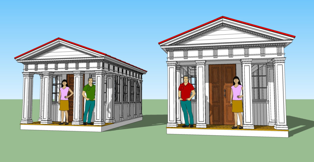 Bärlinor och golvåsar 45×195 mm. Innergolv tjocklek 34 mm. Golvtrall i portiken 28 mm. Fönsterbågar med äkta spröjs, 3 mm enkelglas och tätningslister. Rejäl spegelytterdörr med lås och draghandtag. För det större templet föreslås en pardörr. Takstolar dimensionerade för aktuell snözon. Plåtskoningar på utsatta delar.