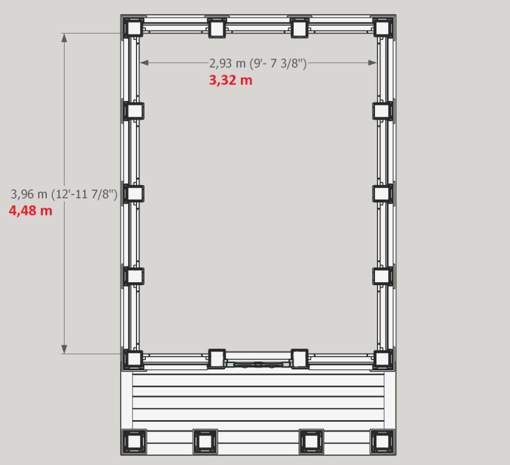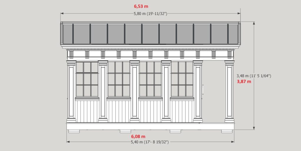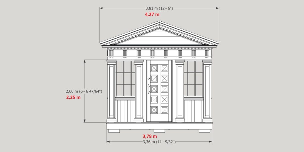 För det STORA templet: Golvytan är ca 14,9 kvm. Rummet rymmer ett bord 2,65 m långt där 10-12 personer kan ha samkväm. Takhöjden inne i rummet är 2,70 m räknat till undersidan av takbjälkarna. Byggytan är 23,3 kvm. Måtten faller inom attefallsbyggreglerna.